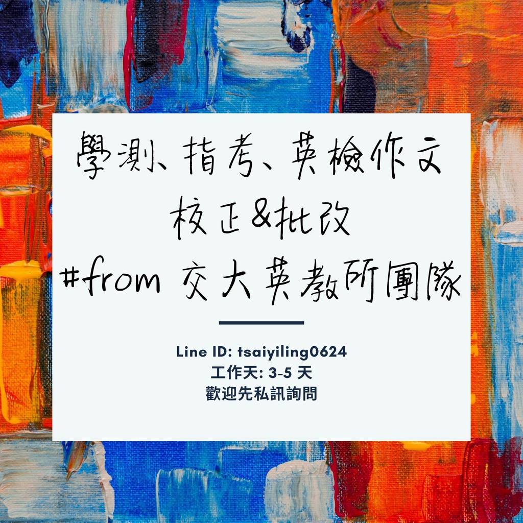 May 12, 2019 · 電腦觀看為一行文、未滿20字、未加標籤,皆依板規水桶七日。 如果是要參加徵文活動,請閱讀置底規定後選擇徵文作為分類喔!! Jul 08, 2021 · 至於指考英文作文,王信斌老師建議,練習時可加強圖表作文和論說文的寫作練習,每周至少練習寫一篇英文作文,寫作較弱的考生應將重點擺在「如何用有限的時間寫出一篇結構完整的作文」,每段都要有主題句、兩到三個支持論點和結論句,寫作程度較好. See full list on blog.wordup.com.tw See full list on blog.wordup.com.tw 看完針對各種大題的破解方法,相信大家針對每個大題該如何備戰一定都有自己的想法了,雖然每個題型看起來都有很多需要再多做準備,但一方面是距離指考也還有將近四個月的時間,這個時候開始努力也一定來得及,另一方面也不是每個大題大家都需要額外準備,有些同學可能是需要掌握閱讀測驗的方法,其他部分沒有問題,在剩下的3個多月中,時間絕對是足夠的。 筆者當年也是拼到指考才上了自己想上的大學,很明白大家看著考上的同學開心玩耍,自己卻還在埋頭苦讀的鬱悶心情。 但請記得,一定要相信自己的努力跟付出,都是有意義的。 不要輕言放棄,相信自己一定能夠做到,就是通過考驗的不二法門喔! 學測指考教材外,多益、托福、雅思、全民英檢,常見英檢定教材皆收錄在商城中,快點擊連結去逛逛吧! 💎 2021.07.18 ☞ 110指考倒數10天 level單字小測驗 💎; See full list on blog.wordup.com.tw 本題為一題題組題,共10題,考生要依據文意從10個選項中填入最佳答案。 大家可以看到,這10個選項為不同的單字,除了熟記全部單字的意思就可以輕易作答外,小編還有一個妙招,讓你在單字熟悉度不夠高、臨時忘記的情形搞定這個大題。 •依照單字詞性、時態判斷各空格可能答案: 背過的單字有的時候會忘、可能會遇到沒背過的單字,這都是準備英文考試常見的問題,若是在考場上遇到這個狀況,小編建議大家從單字詞性跟時態來去判斷,搭配文章的文法型態,就能夠基本判斷出可能相關的答案有哪些。 比方說,從文章句子就其實可以區分到底是要填入名詞或動詞,再從相同詞性的答案去挑選。也許不是每個動詞都會知道意思,但在自已所掌握的動詞中,能填入正確解答,刪去後再從剩下的去選擇,如此一來,只要具備有基礎的單字量,即使不是每個單字都懂,也能夠通過這大題的考驗喔。 這邊小編推薦一本以這個操作方法來解題的教材給大家:「無敵文意選填王」,教材中教你四大實詞:動詞、名詞、形容詞、副詞判斷要領,並進一步讓你了解各種詞性使用時機與位置,用最快速度判別答案選項,這本如此精準的教材,你一定要去下載! 立刻點圖片前往下載吧 💎 2021.07.17 ☞ 110指考倒數11天 level單字小測驗 💎; For more information and source,. See full list on blog.wordup.com.tw Sep 05, 2012 · 《學測指考英文作文》自2010年出版後,廣受高中師生好評。 為了回應讀者對於最新考題的殷切期盼,此次改版,除原先的91~98年學測、指考英文作文考題外,作者黃玟君老師特別增加99~101年最新大考作文題目,幫助考生掌握出題趨勢,以獲取最高分數! Jun 11, 2020 · 💎 97 指考英文科考古題英文單字複習 💎 這是歷屆英文科指考的第一大題單字複習, 歷屆單字裡面有不少會重複出現的, 已經在【高頻率單字篇】幫學弟妹整理了喔, 一共有 10 回的內容, 除了高頻率單字, 歷屆考古題中出現過的單字也有機會在未來考試.